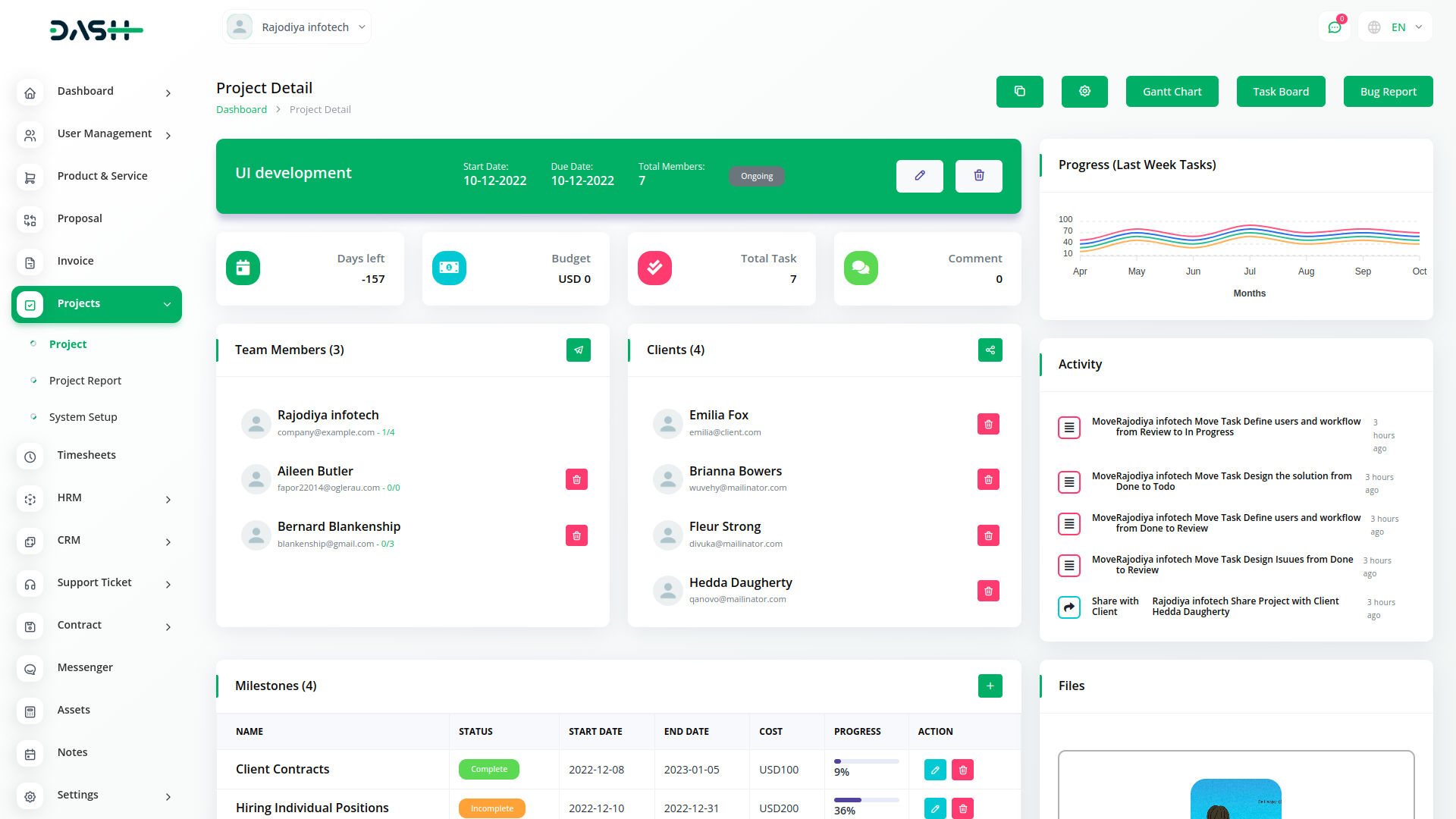 Attach cost and summary to milestones and change the status through the drop-down menu. Get a tab on recent activities of a project and also a graph about progress. Along with that, you can check your tasks’ details under project details with the help of the Gantt Chart.