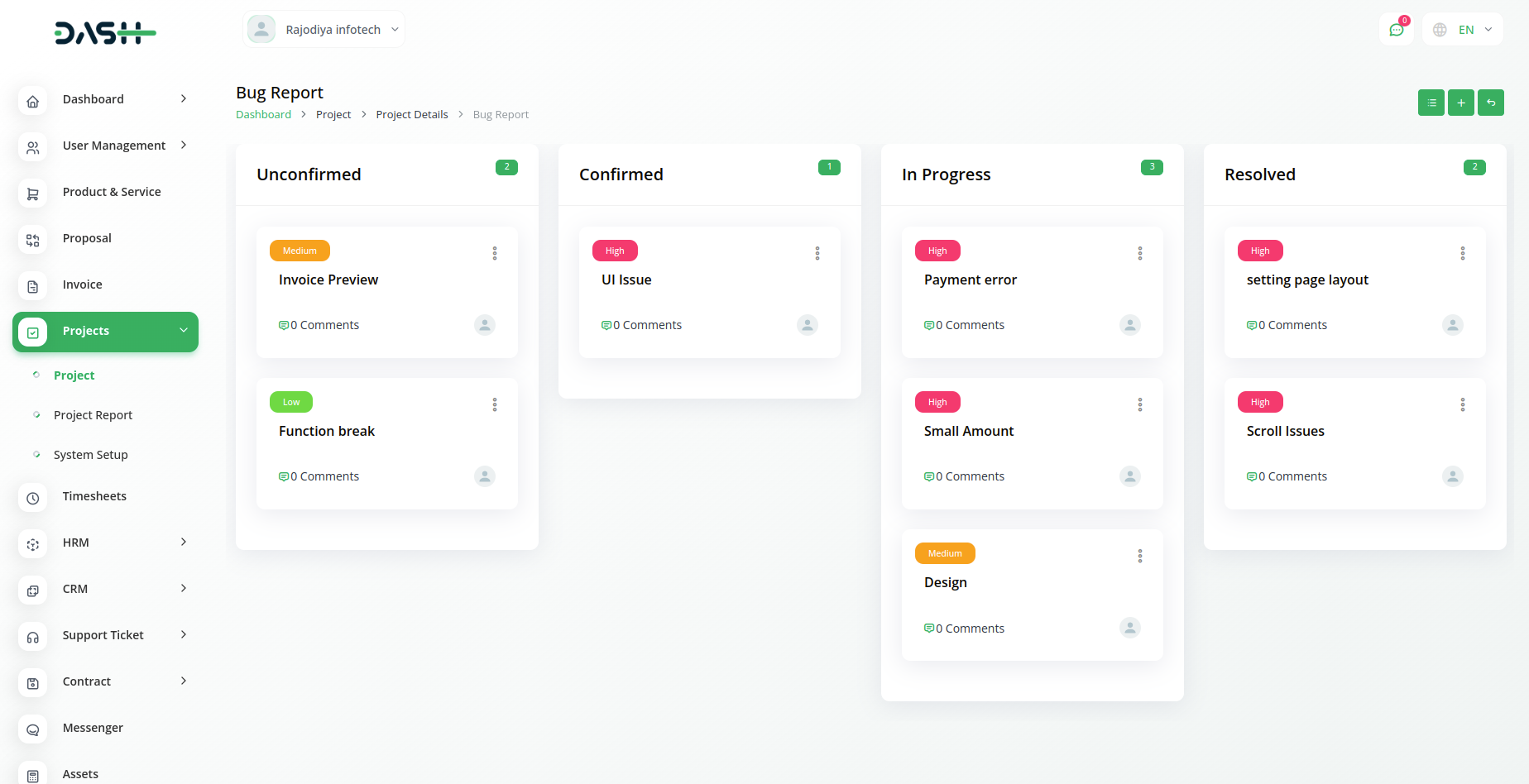 Create new bugs and assign users and priority to them. You can write a note in the text box for the bug description. Also, the status of each bug could be changed through an easy drop-down and Kanban drag system.